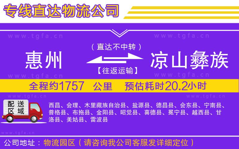 惠州至涼山彝族自治州貨運公司全程約1757公里,專線運輸用時大約20.2小時,可運輸直達西昌、會理、木里藏族自治縣、鹽源縣、德昌縣、會東縣、寧南縣、普格縣、布拖縣、金陽縣、昭覺縣、喜德縣、冕寧縣、越西縣、甘洛縣、美姑縣、雷波縣;力絲盾物流可承接:整車運輸、零擔運輸、大件運輸、轎車托運、危險品運輸、機 131-1305-0066 點擊撥打電話